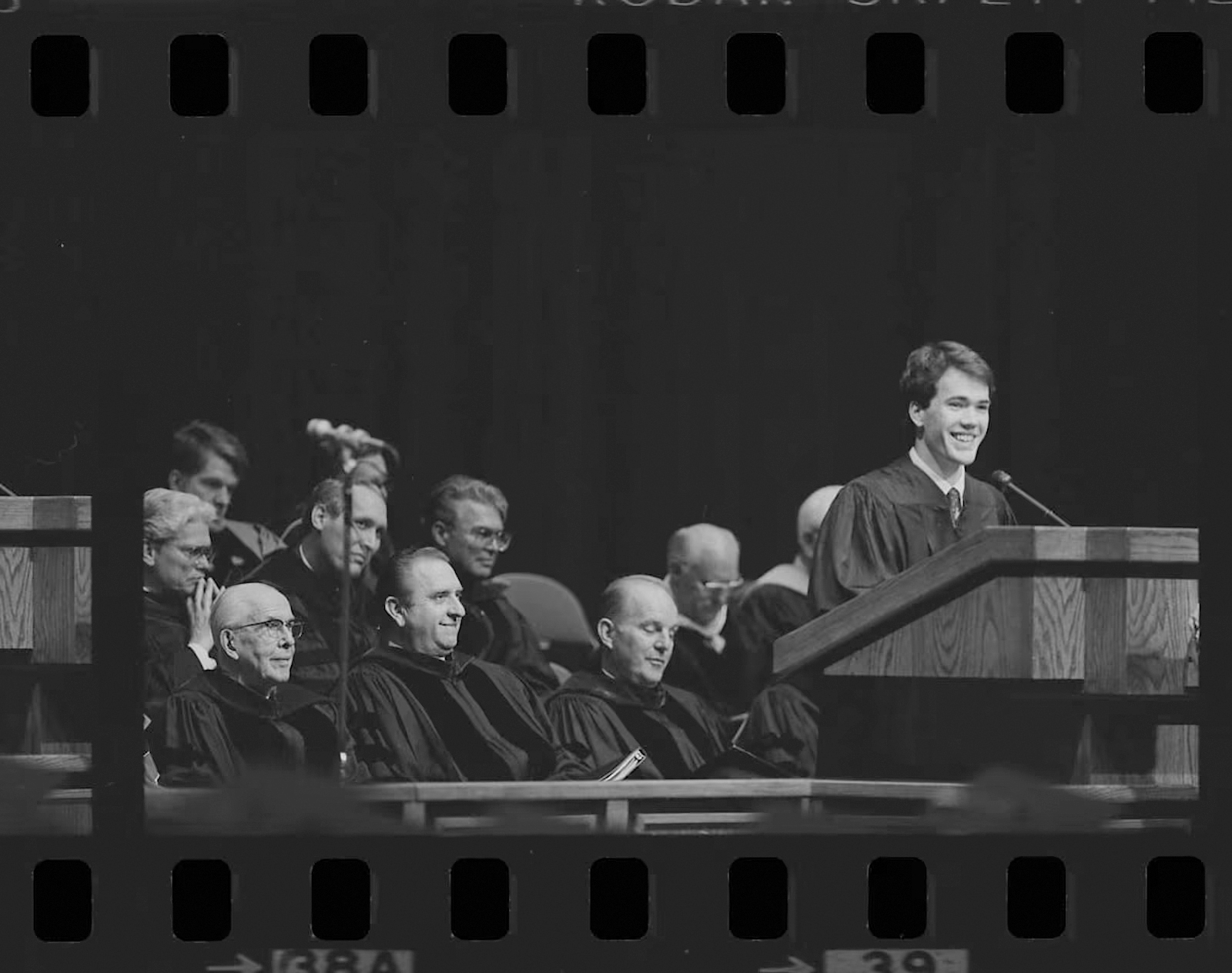 A young Bob Carter addresses the Class of 1986 at BYU.